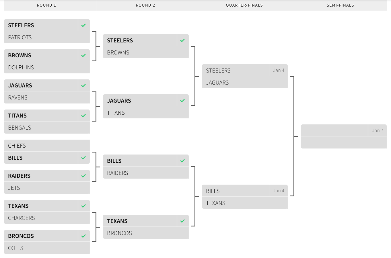- Sun., Jan. 4 – AFC & NFC Quarterfinals