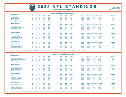Click the NFL Standings button below for the NFL standings, formatted and ready to print perfectly on a single 8-1/2″ x 11″ sheet of paper. Enjoy!