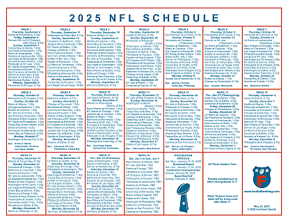 Football Weblog’s exclusive One Page NFL Schedules are designed to fit perfectly on an 8½” x 11″ sheet of paper. Click one of the blue buttons below to open a printer-friendly PDF that’s ready to download, print, and enjoy!