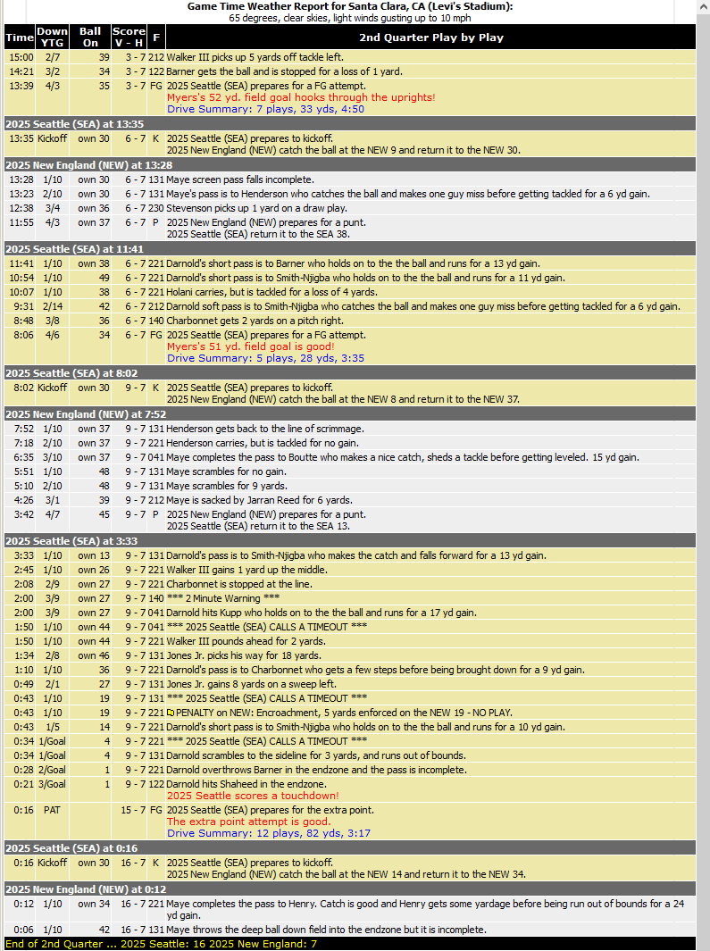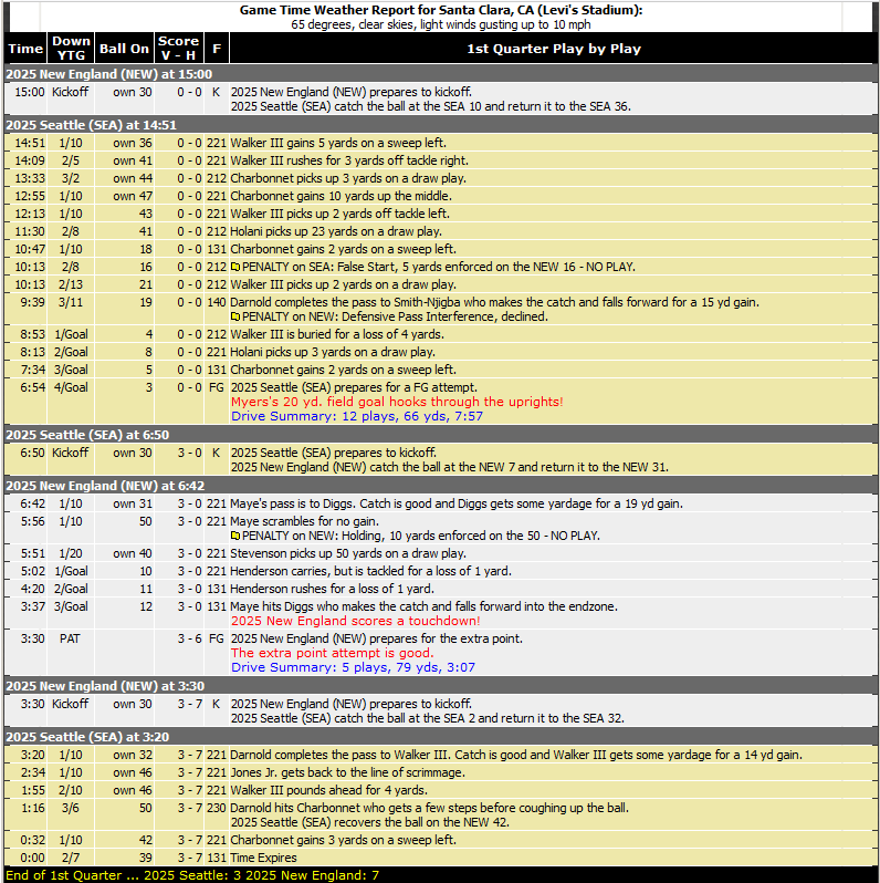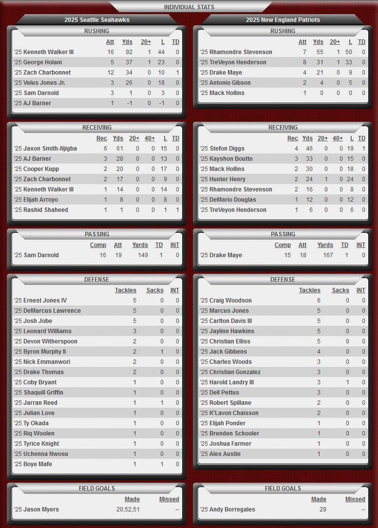 - First quarter: Seattle struck first with a Jason Myers field goal, but New England answered with a touchdown pass from Drake Maye to Stefon Diggs.