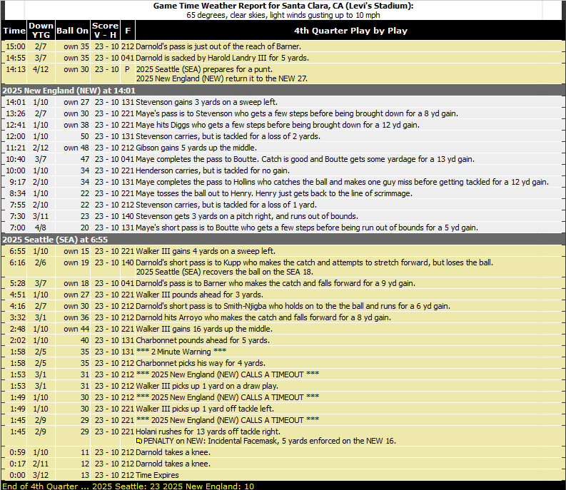 - Fourth quarter: Neither team scored, and Seattle ran out the clock to secure the win.