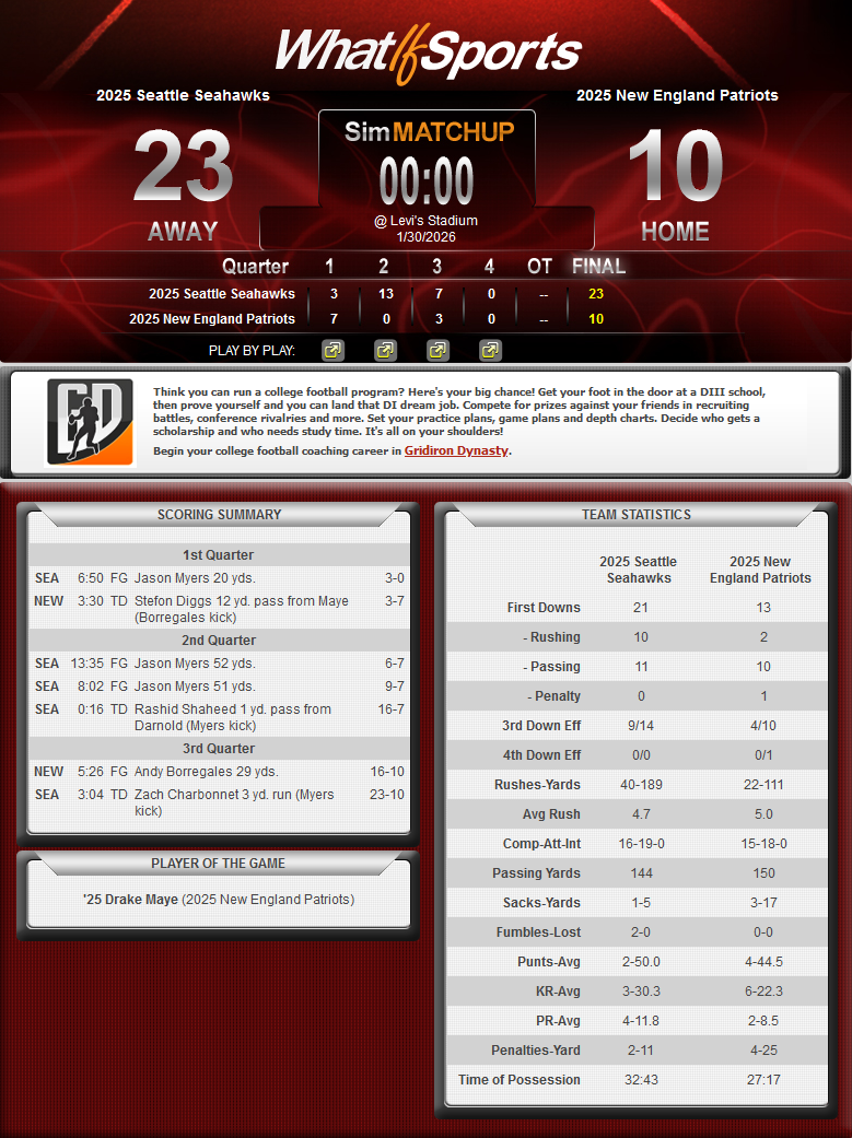 If you want to dig deeper into the simulation, check out the blue buttons below. You will find full team stats, individual player stats, and even play-by-play breakdowns for each quarter. It’s a fun way to see exactly how the Seahawks pulled off their 23–10 win.